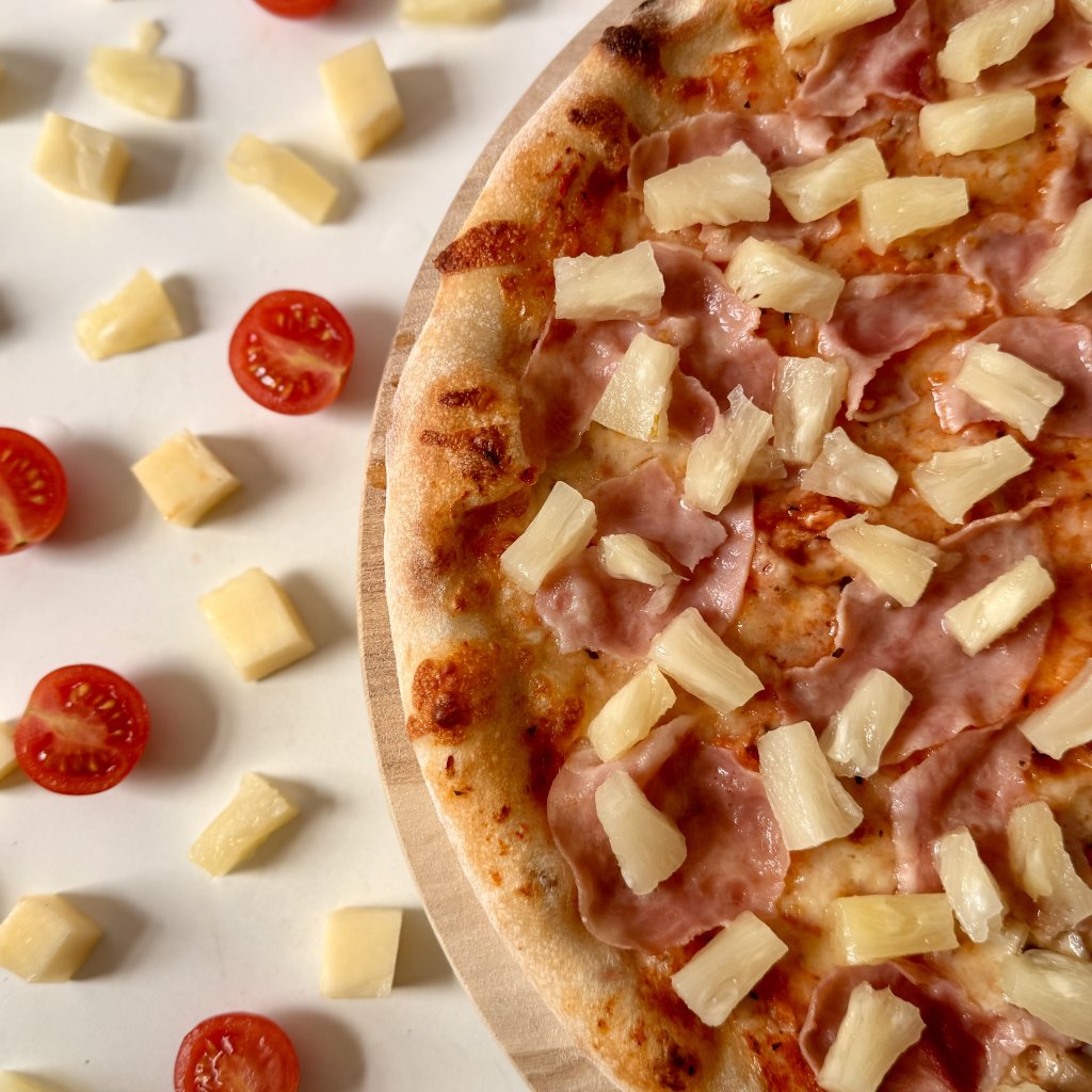 sugo, mozzarella, šunka, ananas